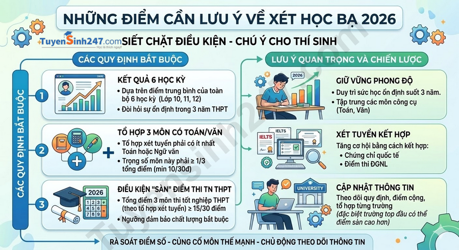 Ngoài ra, với sự thay đổi hình thức xét học bạ, các bạn thí sinh 2k8 có mục tiêu xét tuyển bằng học bạ cần phải trang bị thêm phương thức xét tuyển khác để đảm bảo cơ hội trúng tuyển vì tất cả các trường không còn quy định được chỉ tiêu cho phương thức học bạ là bao nhiêu % như các năm trước đây mà tất cả phương thức được xét cùng thời điểm và có hệ số quy đổi điểm về một điểm chung để xét tuyển.